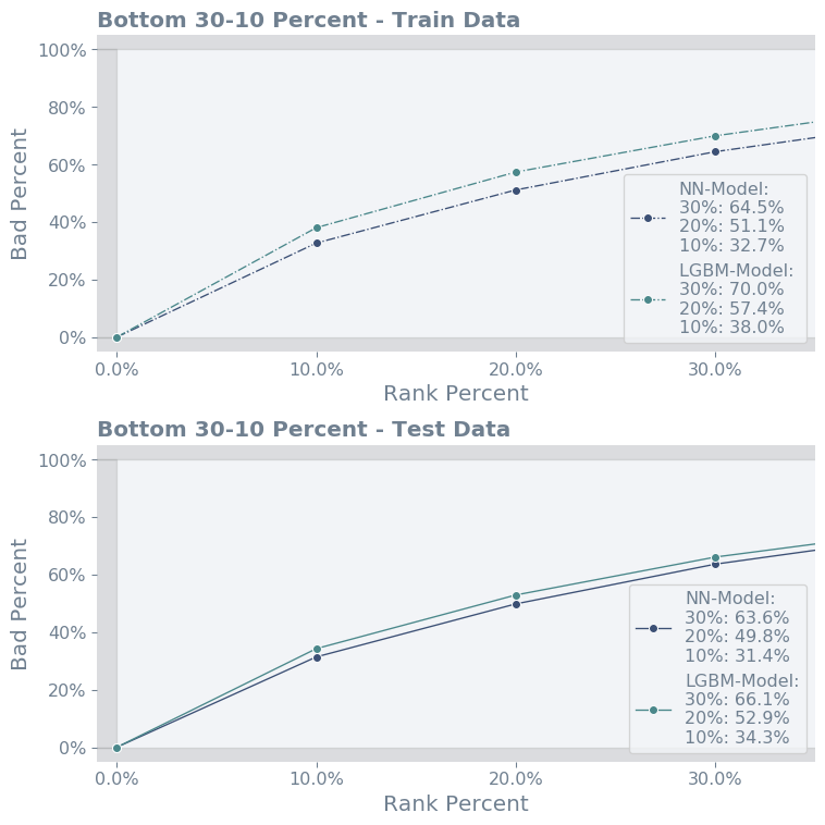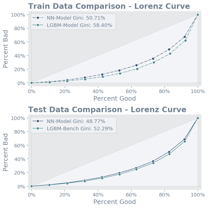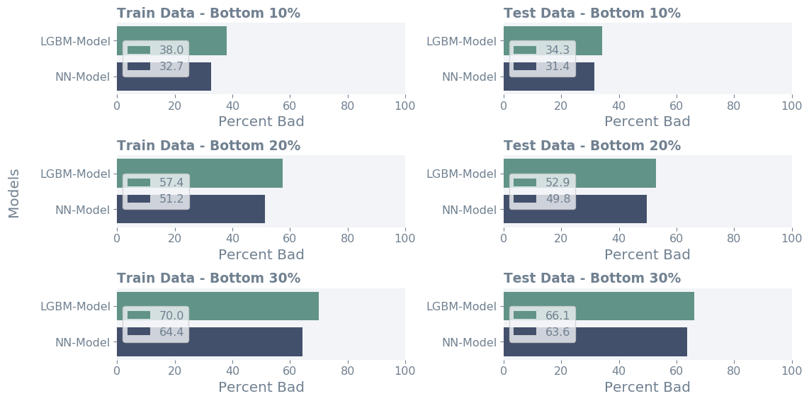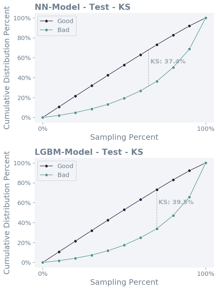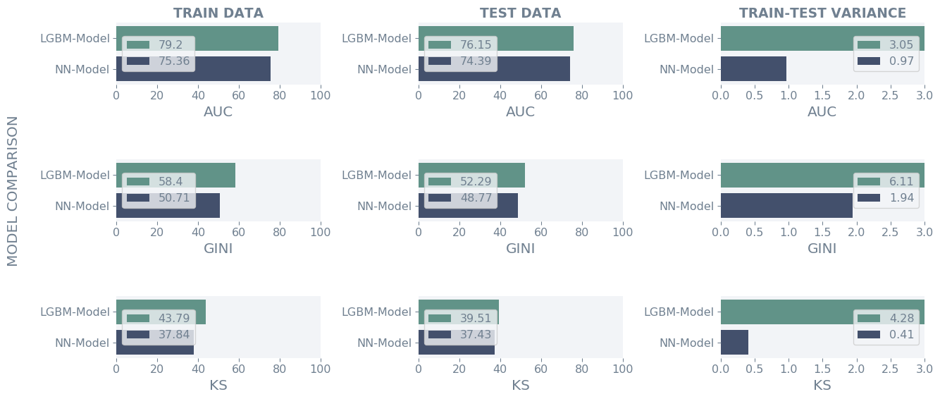 The performance metrics that we have chosen to use are primarily the Area under the ROC (AUR), the Gini, and the KS statistic. Also included are each of the rank order charts produced by each model. Lastly, there is a set of overall visualizations per each model output so that we can visualize the output metrics.